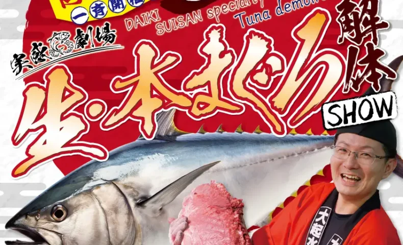 大起水産株式会社は3月20日(金・祝)、「生・本まぐろ解体ショー」を近畿の対象38店舗で一斉開催します。創業50周年を記念したイベントで、回転寿司店とテイクアウト店「街のみなと」が合同で実施する過去最大級の企画です。