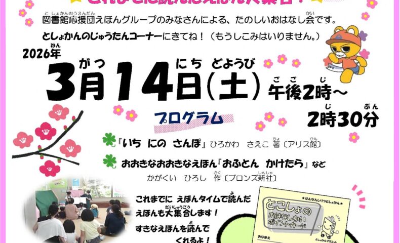 時間は午後2時から2時30分まで、会場は図書館1階のじゅうたんコーナー。対象は幼児や小学生で、申し込み不要で参加できます。