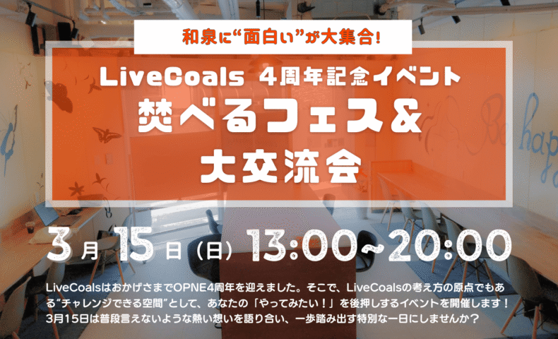 2026年3月15日(日)、和泉市にあるコワーキングスペース&シェアオフィス「LiveCoals」のOPEN4周年記念として、イベントが開催されます。