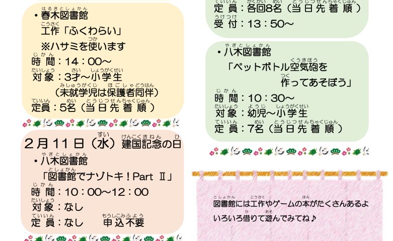 八木図書館では午前10時30分から、「ペットボトル空気砲を作ってあそぼう」を実施。対象は幼児から小学生までで、未就学児は保護者同伴が必要です。定員は7人で当日先着順となっています。