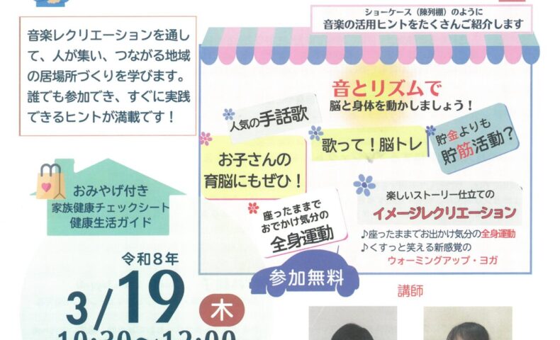 泉大津市旭町のテクスピア大阪で2026年3月19日、音楽レクリエーション講座「みんなでやるから なお楽しい!笑って学ぶ♪音楽レクで健康増進」が開催されます。日本音楽レ・クリエーション指導協会(JMREC)主催で、参加費はWAM助成金対象事業のため無料。手話歌や歌を使った脳トレ、リズム運動などを通じて認知症・フレイル予防や健康づくりを楽しく学べる内容で、地域の集まりで活用できる実践ヒントも紹介されます。申し込みは泉大津市民活動支援センター「おづぷらざ」で受け付けています。