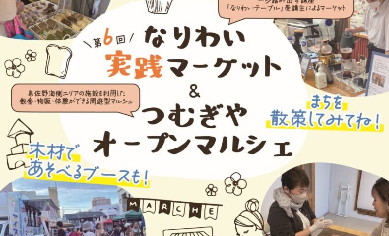 泉佐野駅近くの海側エリアで、受講生による実践型マーケットと周遊型マルシェを組み合わせたイベント「第6回なりわい実践マーケット&つむぎやオープンマルシェ」が2026年3月29日(日)に開催されます。
