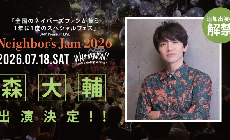 大阪府岸和田市の複合施設 WHATAWON で2026年7月18日、音楽イベント「Neighbor’s Jam 2026」が開催されます。主催する Neighbors Complain に加え、ゲストとして 森大輔 の出演が新たに発表されました。