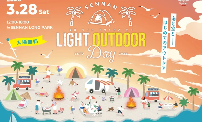 大阪・泉南市の海辺スポット SENNAN LONG PARK(泉南りんくう公園)で、ライトアウトドアイベント「SENNAN LIGHT OUTDOOR DAY」が2026年3月28日(土)に開催されます。入場無料で、初心者でも気軽に楽しめるアウトドア体験が用意されています。