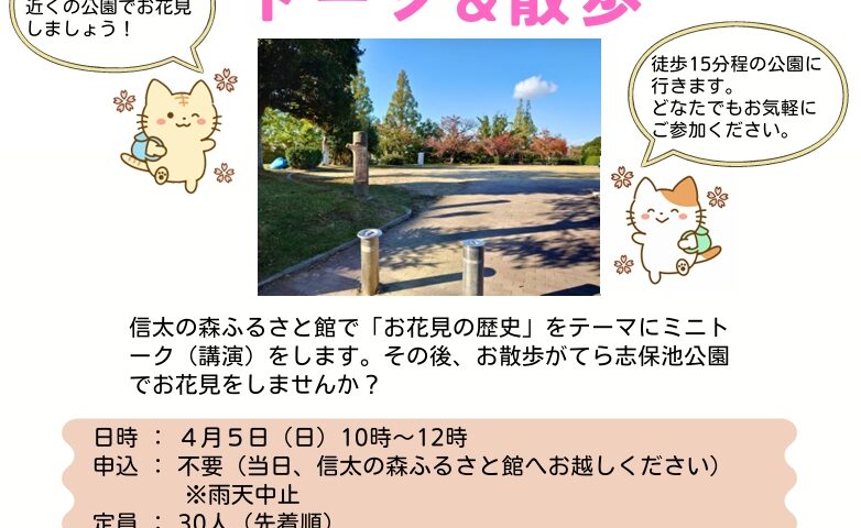 信太の森ふるさと館で、2026年4月5日(日)、「お花見の歴史」をテーマにしたミニトークと散歩イベントが開催されます。講話のあと、春の風景を楽しみながら志保池公園まで歩き、実際にお花見を楽しめる企画です。