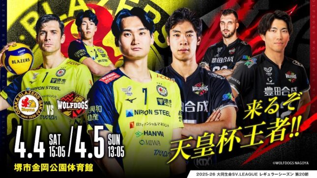 男子バレーボールSVリーグの日本製鉄堺ブレイザーズが、2026年4月4日(土)・5日(日)の2日間、ウルフドッグス名古屋を迎え、堺市金岡公園体育館でホームゲームを開催します。チャンピオンシップ進出を左右する、レギュラーシーズン終盤の重要な一戦です。