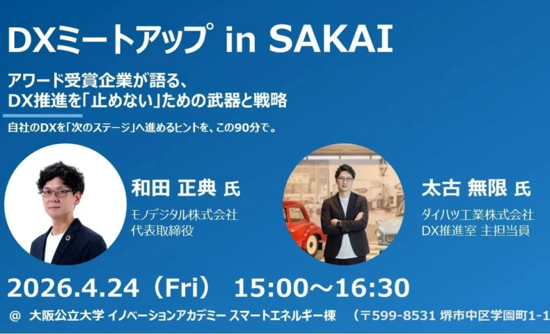 堺市は、堺DX推進ラボおよび一般社団法人日本デジタルトランスフォーメーション推進協会(JDX)と連携し、2026年4月24日(金)に「DXミートアップ in SAKAI」を開催する。本イベントは、同市で開催が決定した「全国ワークスタイル変革大賞2026」近畿大会のプレイベントとして位置づけられている。