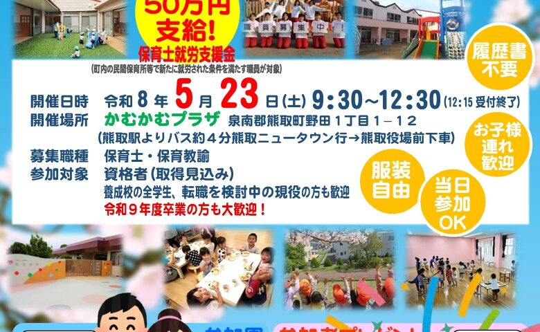 熊取町で「ほいく就職フェア」5月23日開催 町内7園が参加、履歴書不要・服装自由