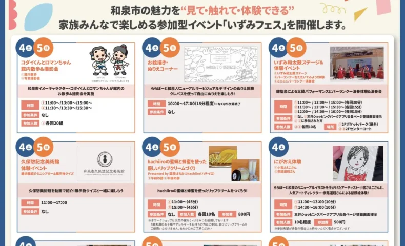 - 親子・子供向け体験イベント ・はじめてのおかいもの!!(ロピアららぽーと和泉店) 4月4日に開催。4歳から6歳の未就学児を対象とした買い物体験企画です。参加にはロピア公式アプリのCポイント交換が必要です。 ・「かいけつゾロリ」登場(宮脇書店コムボックス光明池店) 4月4日・5日の両日、11:00と13:00の2回開催。人気キャラクターとの交流が予定されています。 ・いずみフェス キッズデー(ららぽーと和泉) 4月4日・5日の10:00から17:00まで、2Fセンターコートで開催。和太鼓ステージや久保惣記念美術館協力の体験、キャラクターの館内散歩などが行われます。