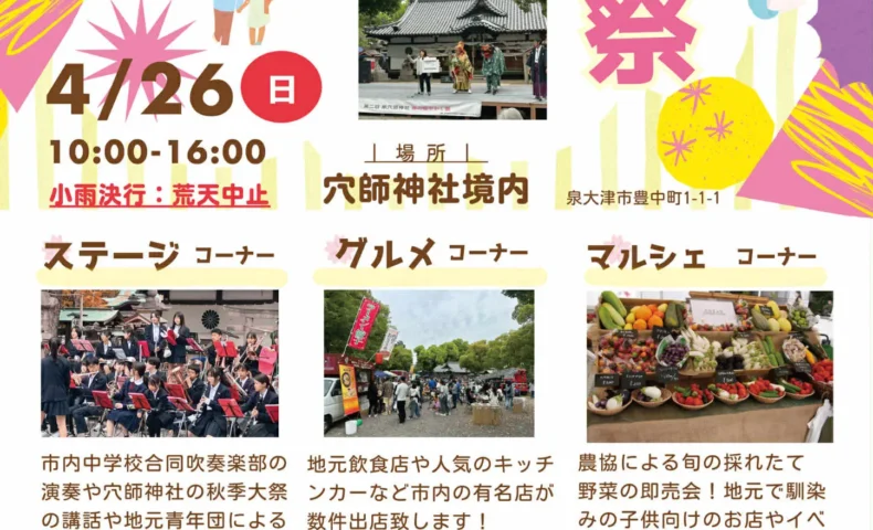 2026年4月26日(日)、泉大津市豊中町の泉穴師神社境内にて、地域振興イベント「穴師校区を盛り上げよう!泉穴師神社春の賑やかし祭」が開催されます。