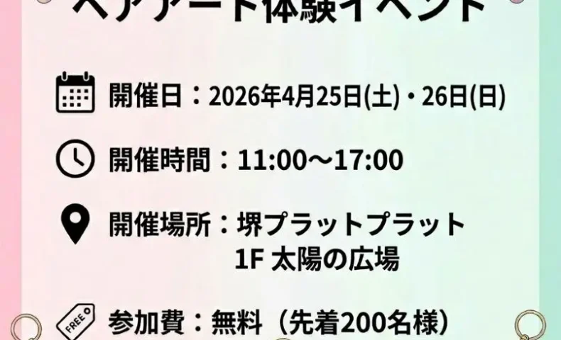 堺駅前の商業施設「プラットプラット」の周年イベントとして、この人気のアート体験が2026年4月25日(土)・26日(日)の2日間限定で開催されます。世界に一つだけのオリジナル作品を作れるチャンスです。