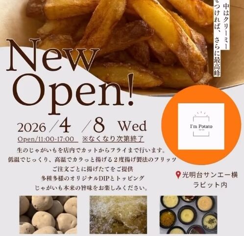 和泉市光明台の商業施設「ラビット(サンエー横)」内に、2026年4月8日(水)、揚げたてポテトの専門店「I’m Potato」がオープンしました。買い物ついでに立ち寄れる立地と、多彩なカスタマイズ性が特徴の新店です。