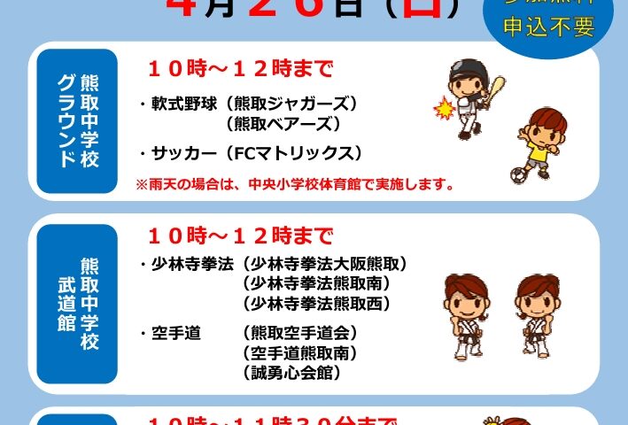 熊取町にて、町内で活動するスポーツ少年団(6種目11団体)が一堂に会する「入団体験会」が、2026年4月26日(日)に開催されます。