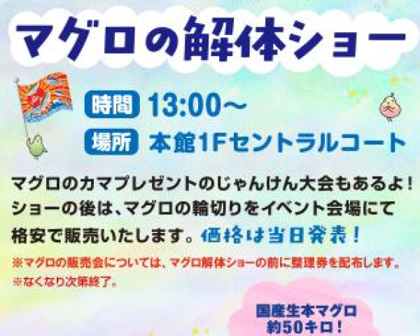 • 内容: 川路水産の協賛により、約50キロの国産生本マグロが登場。間近での解体パフォーマンスに加え、マグロのカマが当たる「じゃんけん大会」も実施されます。