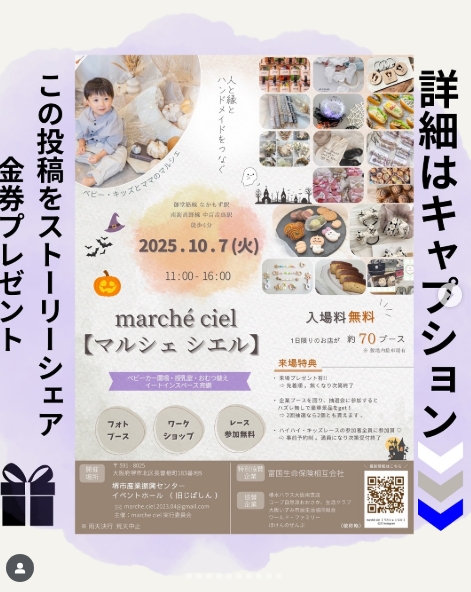 ベビー・キッズ向けのハンドメイドマルシェで、入場料は無料です。約70ブースが集います。1日限りのお楽しみです。さらに来場プレゼントもあるそうです(なくなり次第終了)。おひとり様はもちろん、お子様連れの方も大歓迎とのことなのでぜひこの機会に足を運んでみて下さい。ハンドメイド雑貨や焼き菓子、ランチBOX、ワークショップ、フォトブース、ベビーマッサージなどが楽しめます。時間は11:00~16:00までなので、足を運んでみてください。