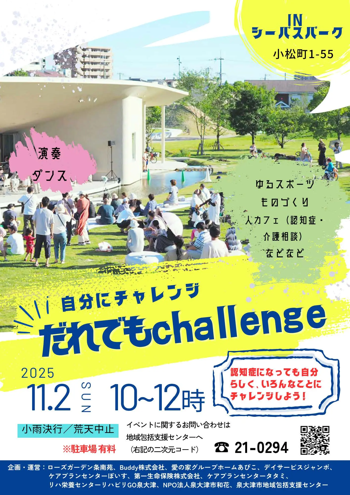 泉大津社会福祉協議会のHPによりますと、認知症になったら何もできなくなるわけではありません。認知症の本人が、自らの姿と声を通じて発信している「新しい認知症観」によって、認知症はさらに、誰にとっても身近になっています。認知症の人が尊厳を保ちながら、希望をもって暮らすことができるよう、そして、認知症があってもなくても、その人らしく過ごし、やりたいことがきるようにと、「だれでもchallenge」を企画しました。参加、観覧自由です。みんなで、いろんなことにチャレンジしよう!とのことです。
