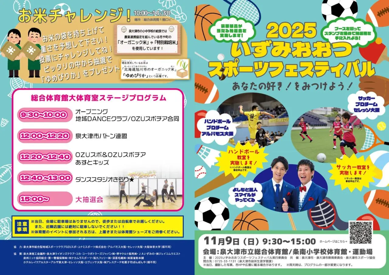 2025年11月9日(日曜日)9時半から15時迄、泉大津市立総合体育館と条南小学校体育館・運動場において、~あなたの好き!をみつけよう~2025いずみおおつスポーツフェスティバルが開催されます!(雨天の場合は一部実施内容を変更して実施)