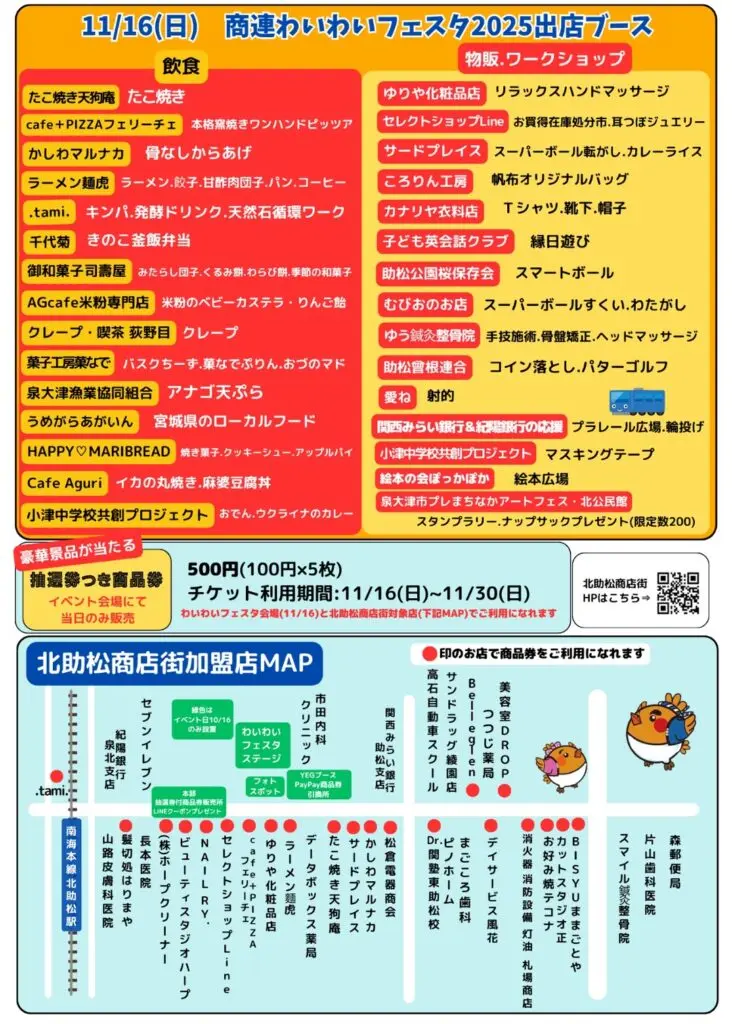 泉大津市のHPによりますと、11月16日(日曜日)11時から15時まで、関連イベント、「商連わいわいフェスタ」が北助松商店街で開催されます。