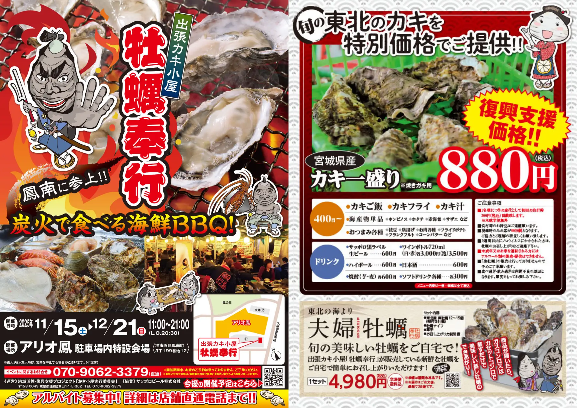 [開催住所] 〒593-8325 大阪府堺市西区鳳南町3-199-12 [開催期間] 2025年11月15日(土)-12月21日(日) [営業時間] 11:00-21:00(L.O.20:30) [お問合せ] 070-9062-3379Instagram:https://www.instagram.com/kaki__bugyo/
