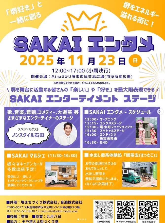 堺から世界へ!を合言葉に開催される「SAKAIエンタメ」第2弾です。昨年も大好評でしたが、今年は更にパワーアップして様々なパフォーマンスが披露されます。歌、音楽、踊り、コメディ、大道芸その他、堺で活動するさまざまなエンターテナーが、堺を舞台に活動する皆さんの「楽しい」や「好き」を最大限表現します。スペシャルゲストとして、ノンスタイル石田さんが登場しますよ。