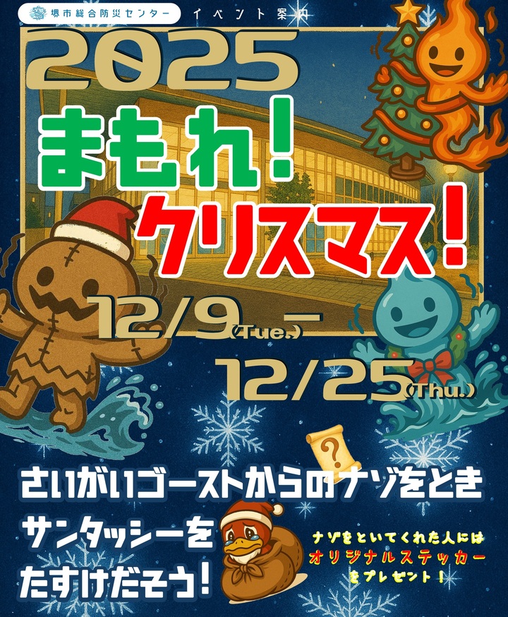泉州ニュース 【堺市】クリスマスイベント「さいがいゴーストからサンタッシーをたすけだそう!」 2025.11.30 泉州ニュース ストーリー 開催概要 開催場所 堺市総合防災センター 防災啓発施設内 開催日 12月9日(火曜)~12月25日(木曜)※休館日は除きます 時 間 9:00~17:15 参考所要時間 約15分 参加無料・予約不要 クリスマス限定!自由参加の謎解きプログラム! 防災に関する問題を解いて楽しく学ぼう! あそびかた ①まずは受付で「さいがいゴーストからの挑戦状」をもらおう! ②防災啓発施設内にあるナゾを解いて挑戦状に答えを書き込もう! ⓷答えを書き込めたら挑戦状を受付にもっていこう! ④見事正解できた人にはオリジナルステッカーをプレゼント! クリスマスイベント「さいがいゴーストからサンタッシーをたすけだそう!」 Post Share Hatena Pocket RSS feedly Pin it 記事のタイトルとURLをコピーする 宿泊施設2階客室から転落か 泉南のバス運転手の男性が死亡 香美 前の記事 関連記事 【関西空港】MDMA8千錠密輸疑いでスペイン国籍の男逮捕 スーツケースの底部に隠す(産経新聞) 2024.11.06 【和泉市】いつもは平日だけのお宝探しイベントも! 道の駅いずみ山愛の里で「秋の味覚祭」開催(Yahoo!ニュース) 2024.10.16 堺市 新金岡地区5.5ヘクタールを売却 地区再生準備へ 2022.07.15 【貝塚市】つげさんとパチリ 貝塚市制80周年記念、市役所前に石像(毎日新聞) 2024.04.16 関西空港貨物取扱、12月は8.4%増(LOGISTICS TODAY) 2025.01.09 【泉大津市】防災の日 留学生対象の津波避難訓練(NHKニュース) 2025.09.01 【堺市】雪模様 手元から広がる(読売新聞) 2024.08.18 【堺市堺区】2/20(火)~22(木)に「堺東」で『ガシバル』が開催(号外ネット) 2024.02.02 コメント コメントは利用できません。 トラックバック ( 0 ) この記事へのトラックバックはありません。 トラックバックURL 返信をキャンセルする。 名前(例:山田 太郎) ( 必須 ) E-MAIL ( 必須 ) - 公開されません - URL Δ コメントを書く