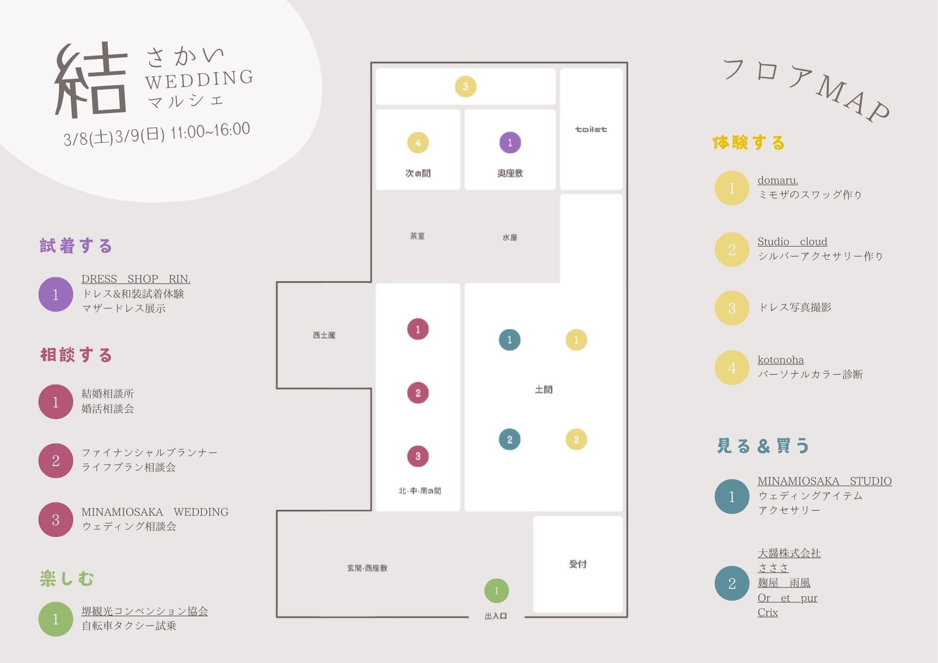 出店:生活雑貨・調味料・お菓子・ウェディングアイテム・ウェディングドレス・花嫁和装・マザードレス・ワークショップ・結婚相談会・ファイナンシャルアドバイザー・結婚式フォトウェディング相談など