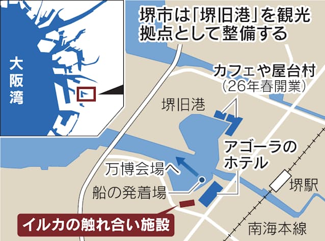 日本ドルフィンセンターはさぬき市と高知県室戸市で同種の施設を運営している。都市部で完全屋内は全国でも珍しいという。隣接ホテルの「ドーセット バイ アゴーラ 大阪堺」と集客で相乗効果を引き出すため、宿泊プランにイルカ体験を組み込むことを検討する。