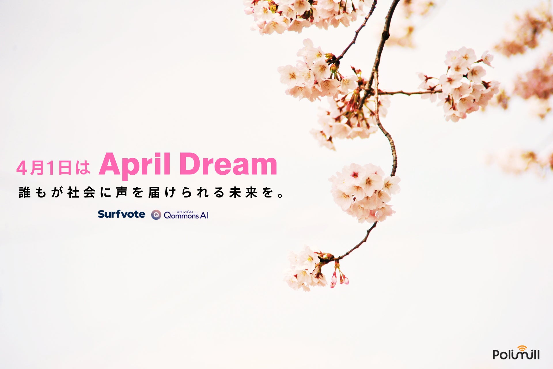 当社は、4月1日を夢を発信する日にしようとするApril Dreamに賛同しています。このプレスリリースは「Polimill」の夢です。私たちPolimill株式会社は、「社会の課題に声を届ける」というミッションを掲げ、社会課題に特化したSNS型プラットフォーム「Surfvote」や、自治体向け生成AI「QommonsAI」の開発・提供を行っています。