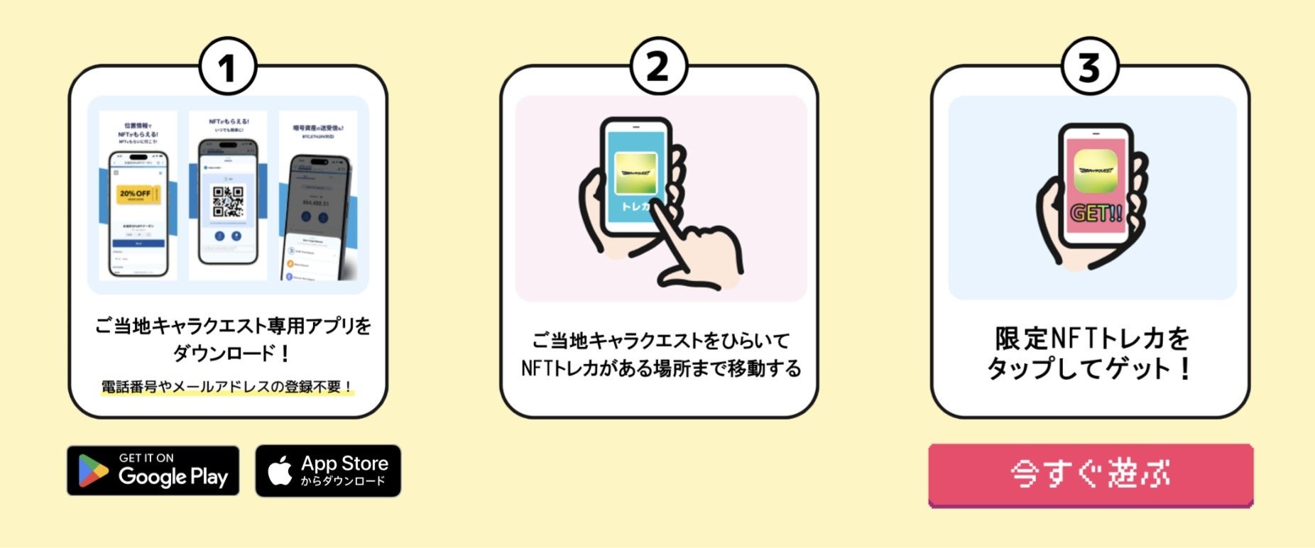 「ご当地キャラクエスト」専用マップで入手可能です。マップ上に表示されるピンスポットを探索し、近づいてタップし「受信」ボタンを押すことで、自動的にWeb3ウォレット「ダイバーウォレットPro」と連携し、スムーズにNFTを受け取ることが可能です。