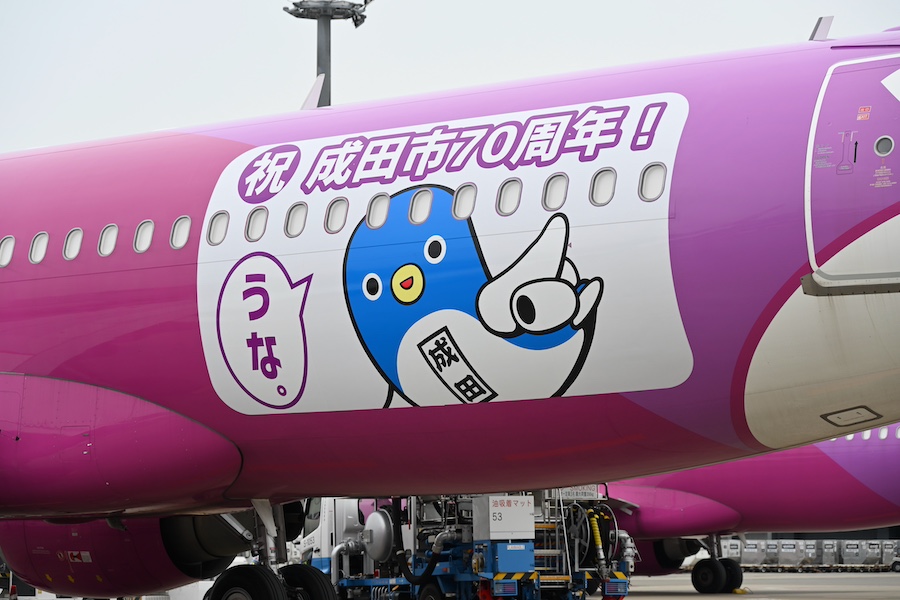 「うな。」の文字がちょっとシュール LCCピーチに新たな特別塗装機出現 12月ごろまで運航(gooニ…