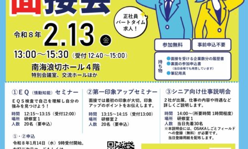 2026岸和田・貝塚合同就職面接会求職者の就業機会創出と、企業の人材確保を目的とした「2026岸和田・貝塚合同就職面接会」が、2026年2月13日(金…
