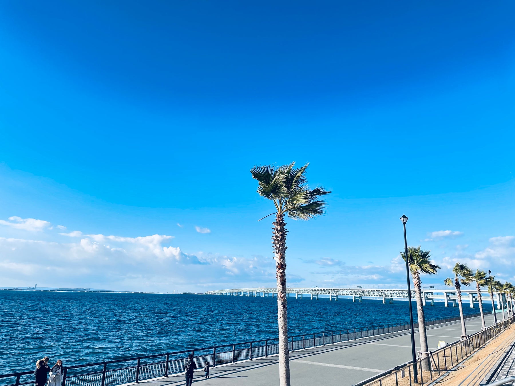 ヤシの木が立ち並ぶシーサイドパークからは、アウトレットのあるりんくうタウンから伸びる長い空港連絡橋や、関西空港から飛行機が次々と飛び立っていく様子をのんびりと楽しむことができます。