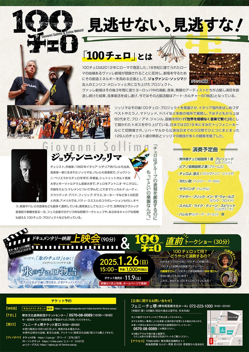 この度フェニーチェ堺(指定管理者:公益財団法人堺市文化振興財団)は、開館5周年を記念して、2025年3月30日(日)に世界的な天才・鬼才チェリスト、ジョヴァンニ・ソッリマとチェリスト、エンリコ・メロッツィを中心に100名のチェリストを一堂に集めた「100チェロ・コンサート」を関西初開催します。