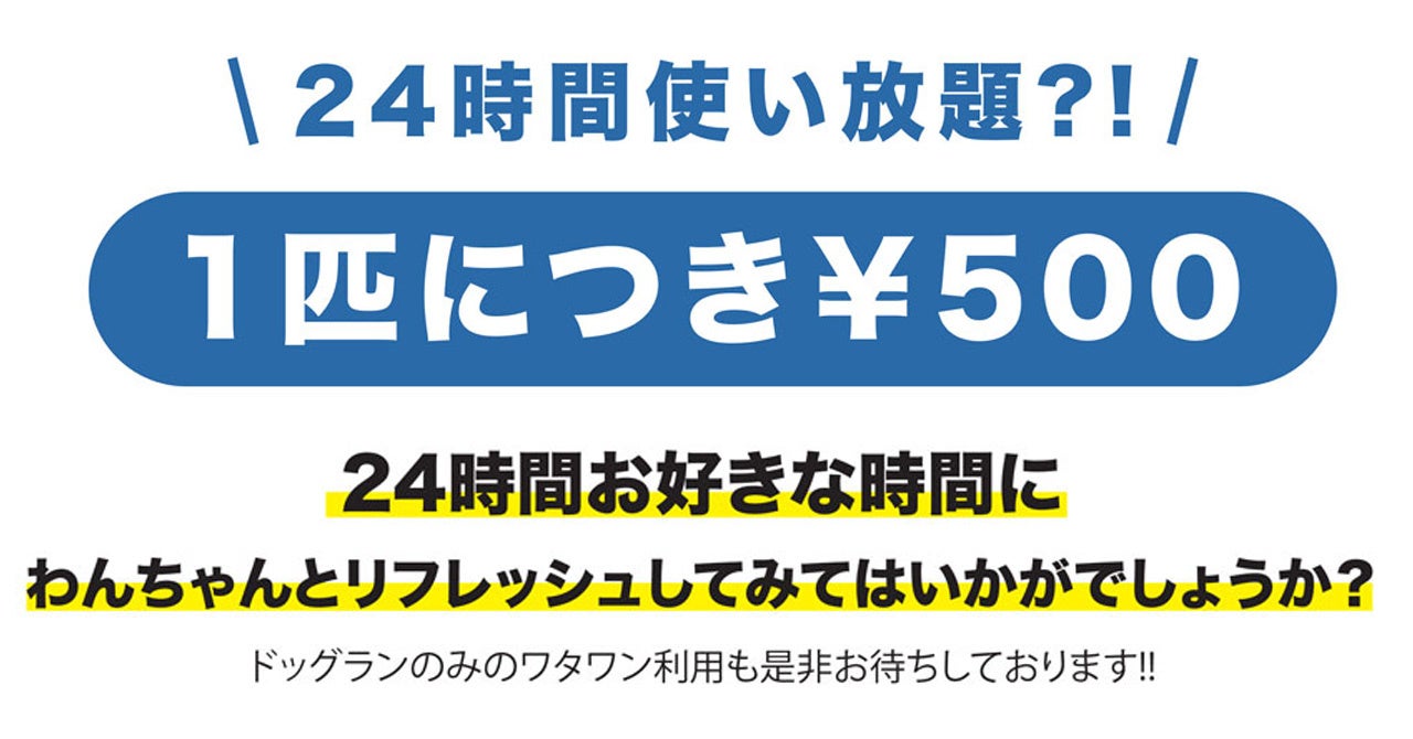 WHATAWONでは、【24時間営業】のドッグランを提供しております。飼い主様のライフスタイルに合わせ、いつでもご利用いただけるのが大きな魅力です。料金は1匹につき税込み¥500で、広々としたスペースでわんちゃんと一緒にリラックスした時間をお過ごしいただけます。