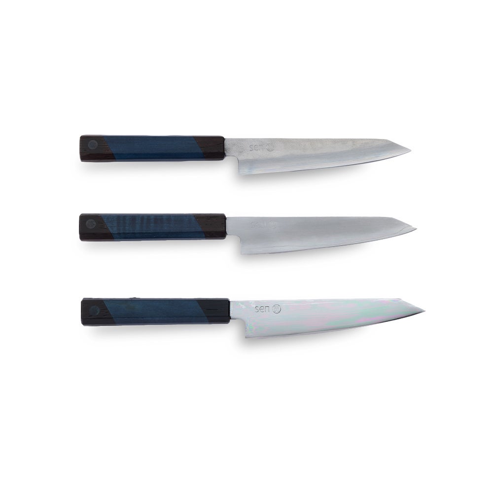現地でのヒアリングをもとに、フランス人のアートディレクター、プロダクトデザイナーと共に手掛けました。刀身は切れ味鋭い炭素鋼に近いステンレス鋼(銀紙三号)を採用。銀紙三号は、熱処理が極めて難しいことから、主に堺でしか取り扱っていない希少な商品です。鍛冶師、刃付け師ともに1日10本程度しか生産できないため価格はやや張りますが、最後の最後、短くなるまで使えるので 費用対効果が高く、環境にも優しいといえます。