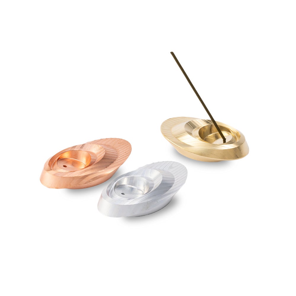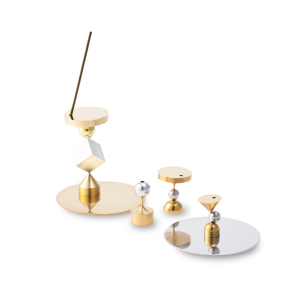 「アルミ・真鍮・銅という異なる素材」×「丸・三角・四角の異なる形」のオブジェクトを絶妙なバランスを保ちながら積み上げていく、ハイテン工業特有の「はめ合い」技術が活かされたお香立てです。
