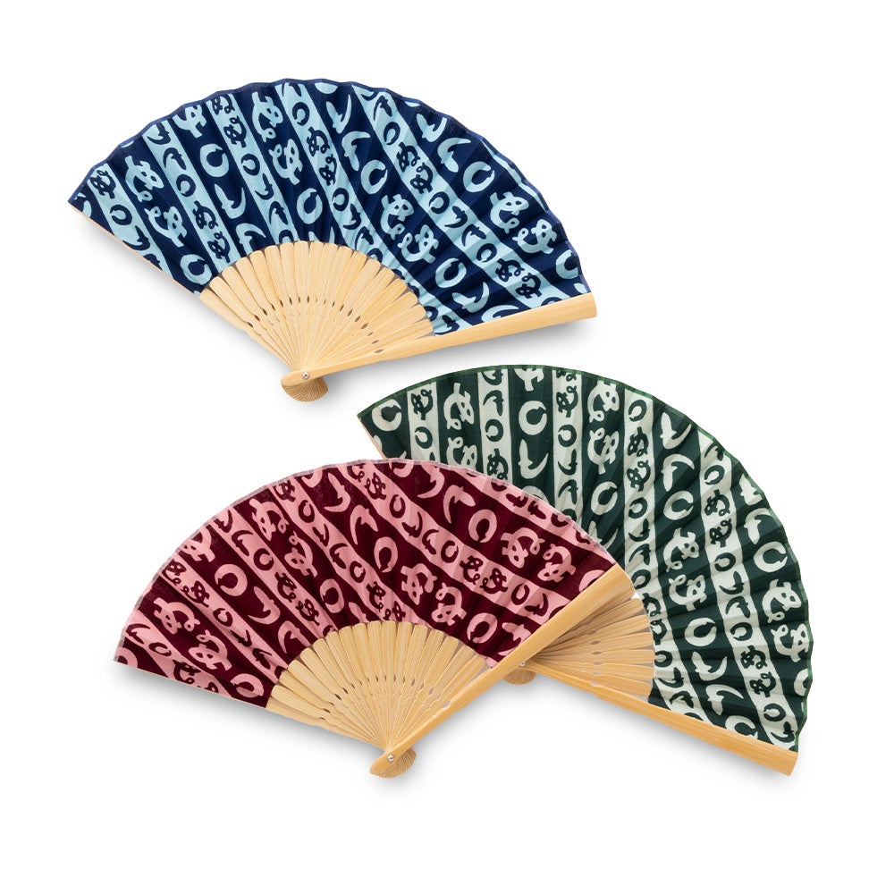 注染で染め上げた3種類の和柄布を使った扇子です。表裏がないという注染の特徴を活かし、1枚の布で軽やかに仕上げられています。手ぬぐいの布を使っているので丈夫なのも魅力。鮮やかな発色は日常をぱっと華やかにしてくれます。