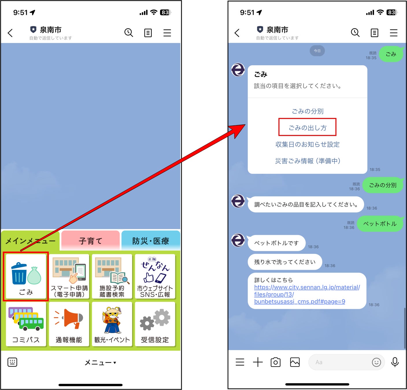 「ごみ」では、「ごみの一問一答機能」を搭載しております。LINEのトーク画面に直接「ペットボトル」「乾電池」などの破棄したいごみの具体名を入力することで、分別方法や捨てる際のポイントを自動返答します。