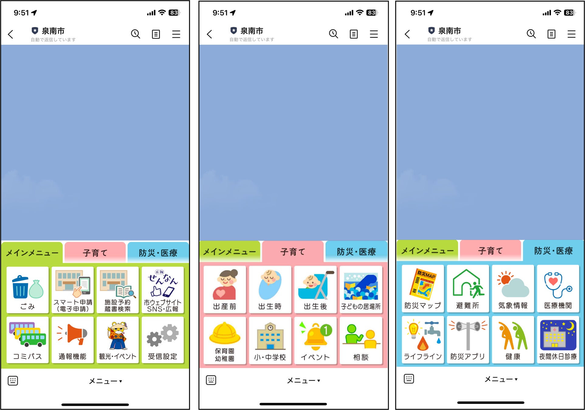プレイネクストラボ株式会社では、泉南市のLINE公式アカウントの開始にあたり、システムの提供と構築のサポートを行なっています。