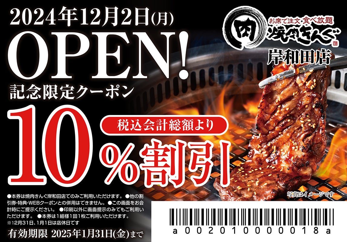 『焼肉きんぐ』は、2024年12⽉2⽇(月)に全国335店舗目となる『焼肉きんぐ 岸和田店』(大阪府岸和田市)をグランドオープンいたします。これを記念して、2025年1月31日(金)までご利用いただける『焼肉きんぐ 岸和田店』限定のwebクーポンを配布します。