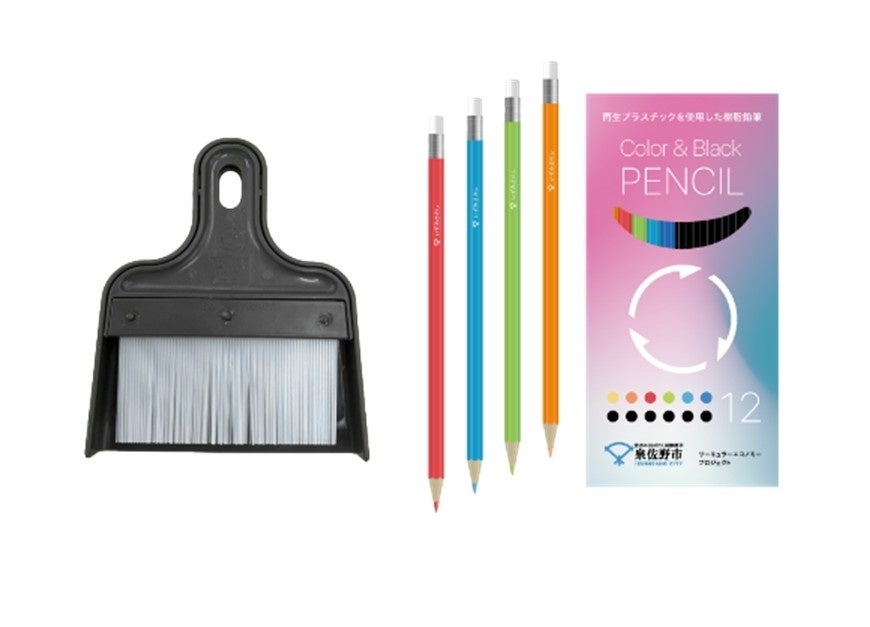 - 再生材使用製品の提供による地域住民への啓発ペットボトルキャップの回収にご協力いただいた児童や地域住民の皆様に、再生材を使用したテーブルホウキや樹脂鉛筆を提供し、資源循環に関する取り組みについての啓発を進めます。