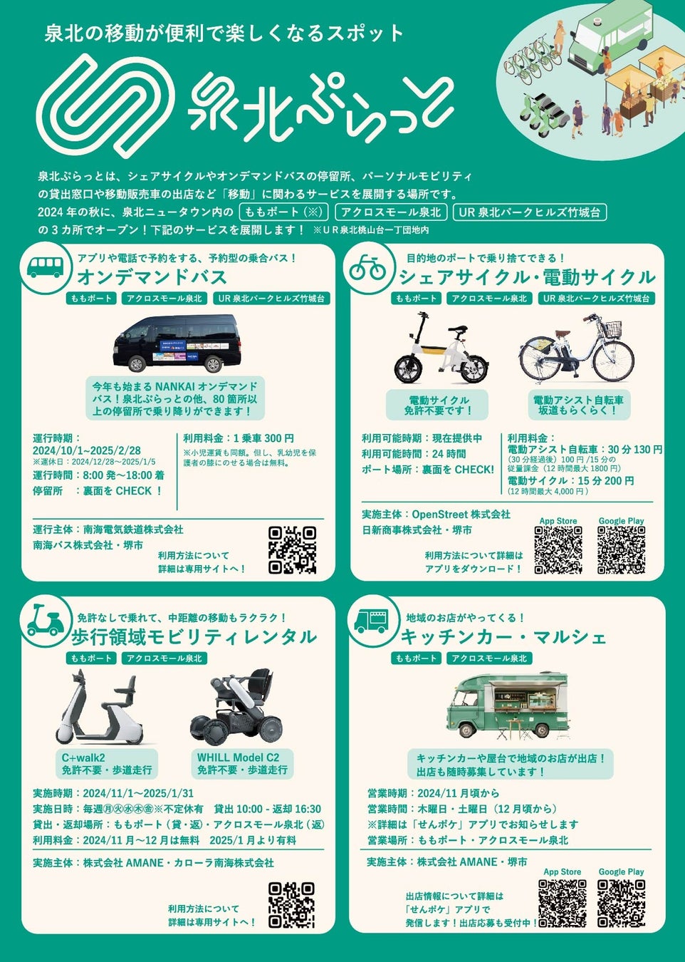 このたび、株式会社AMANE(本社:東京都港区、代表取締役社長:井上 佳三)と堺市は、移動利便性及び生活の質の向上をめざして、オンデマンドバスやシェアリングモビリティなど複数の「移動サービス」と、飲食や物販などの「生活サービス」が集約された交流拠点『モビリティハブ』を、泉北ニュータウン地域内に3か所設置する実証事業を実施します。複数の『モビリティハブ』を同時に設置する実証事業は日本初の取組です。