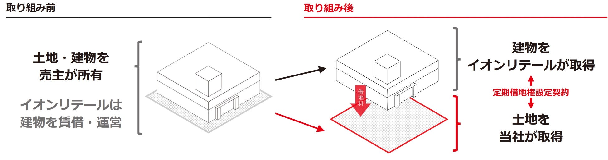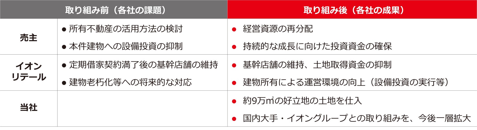 三者間での協議を経て、売主からイオンリテールが建物を取得し、当社が土地を取得するスキームが実現いたしました。本件に先立ち、当社は、2021年に同様のスキームによりイオンモール富谷店(宮城県)での取り組み実績を有しており、この実績が、イオンリテールが当社を事業パートナーとして評価・選定した要因となりました。当社は、本件取り組みにより、約9万㎡の好立地の土地を仕入いたしました(取得額80億円以上※2)。