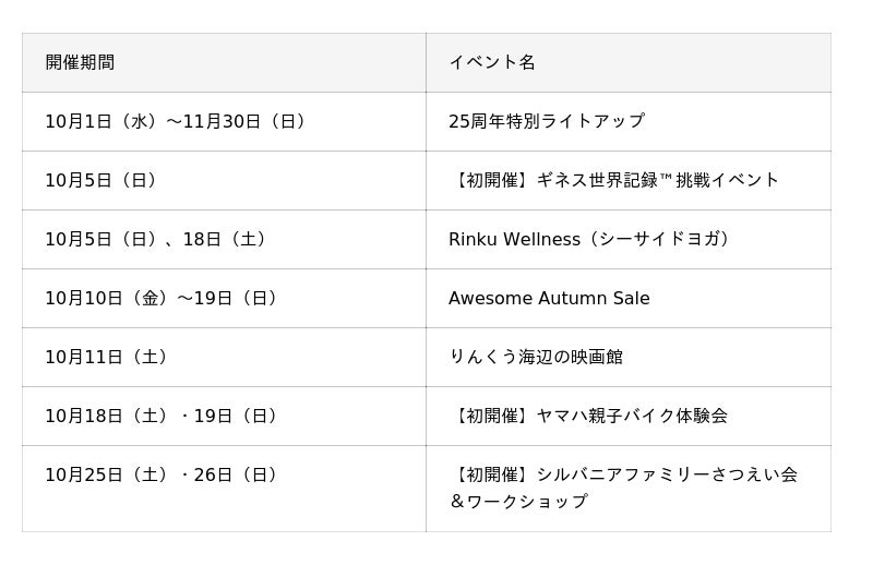 りんくうプレミアム・アウトレット(所在地:大阪府泉佐野市 運営:三菱地所・サイモン株式会社)は、11月に開業25周年を迎えるにあたり、周年イヤーを地域の皆様やご来場のお客様と共に楽しみながら盛り上げるべく、10月の月間を通して参加型イベントを毎週末開催します。