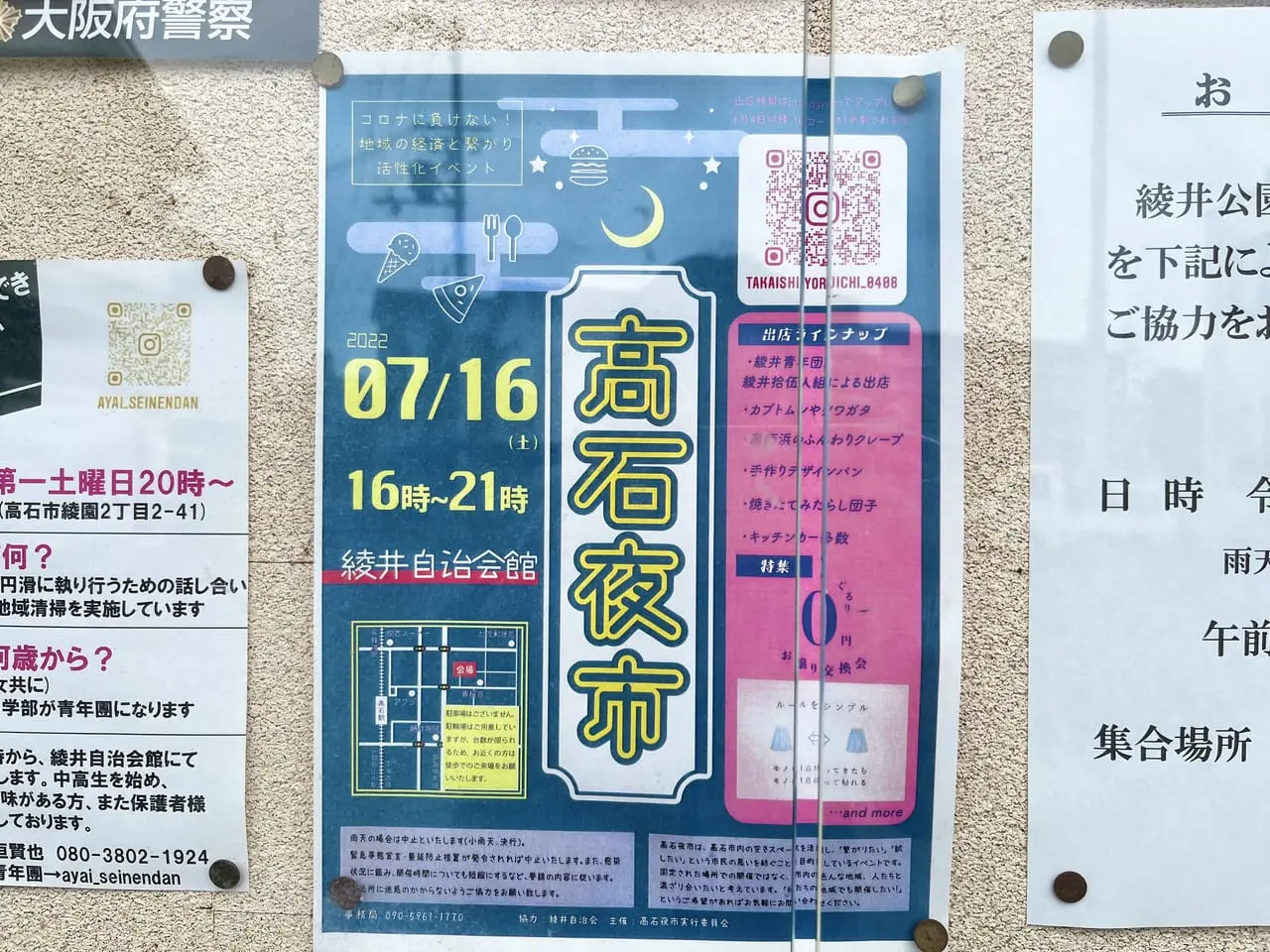 地域の経済と繋がりを活性化するイベント『高石夜市』が綾井自治会館で開催されます。開催日は2022年7月16日(土)で、時間は16時から21時までです(小雨天…