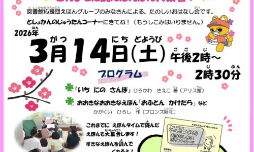泉南市立図書館で2026年3月14日、読み聞かせイベント「としょかんえほんタイム 春スペシャル!」が開催されます。図書館応援団えほんグループによるおはなし会で…