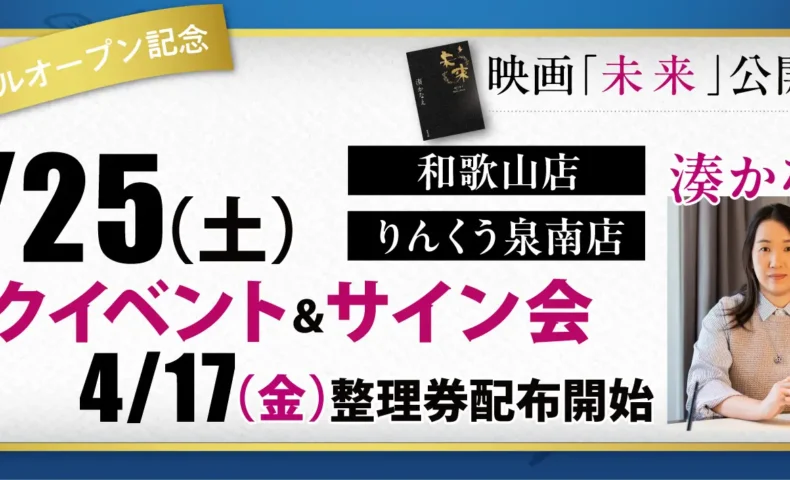 今回のリニューアルを記念し、2026年5月8日公開の映画『未来』の原作者・湊かなえ氏を招いたスペシャルイベントが4月25日(土)に開催されます。当日は、和歌山店(午前)とりんくう泉南店(午後)の2店舗を巡るファン必見のスケジュールとなっています。