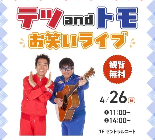 2026年4月26日(日)、イオンモールりんくう泉南にて、人気お笑いコンビ「テツandトモ」によるお笑いライブが開催されます。