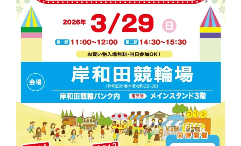 子どもだけで売り買いを行う人気イベント「キッズフリマ」が、3月29日(日)に岸和田競輪場で初開催される。会場は岸和田競輪バンク内で、入場は無料。お金の大切さやコミュニケーション力、リユース意識を学べる体験型イベントだ。