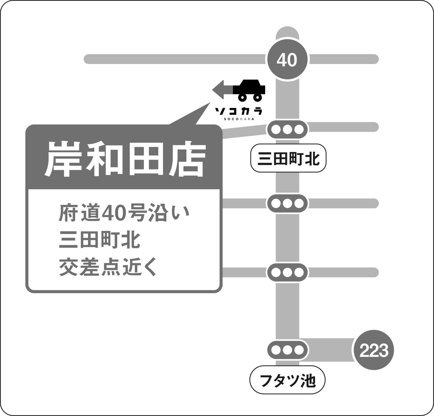 ソコカラセレクト岸和田は、ソコカラ初となる中古車販売店です。府道40号沿いに位置し、「和泉中央駅」から車で10分、「岸和田駅」から車で20分のアクセスしやすい場所にございます。